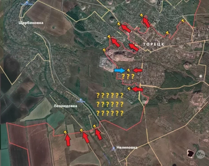 На Торецком направлении подразделения ВС РФ продвинулись по направлению к Леонидовке. Ранее наши бойцы уже присутствовали на этих позициях, но вынуждены были отступить. В центральной части Торецка штурмовые отряды ВС РФ продвигаются вперёд. Сейчас наши бойцы находятся на подступах к одному из терриконов в центральной части города.
