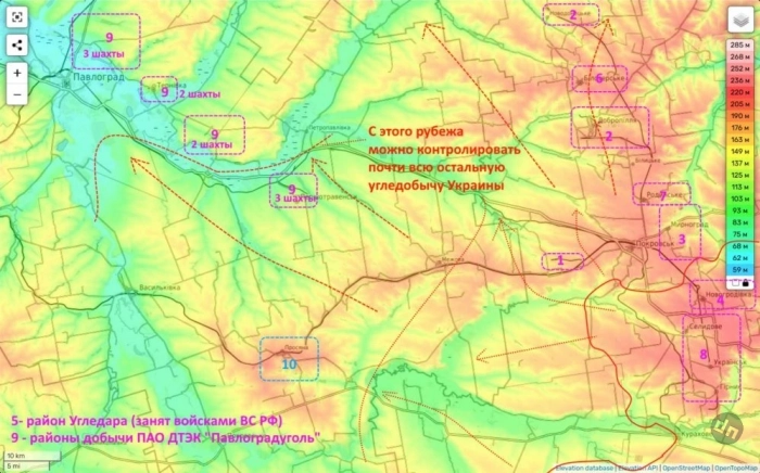 Вместе с этим в своём Telegram-канале Юрий Подоляка рассказал о значимости города Павлоград, который находится недалеко от Покровска. Он напомнил, что потеря Покровска приводит киевский режим к потере примерно 40% довоенной добычи угля на Украине. Но, и оставшийся уголь, который может еще помогать выплавлять оставшуюся сталь и обеспечивать поставки на большую часть украинских ТЭС тоже является частью Западного Донбасса и расположен очень компактно на 10 шахтах объединения «Павлоградуголь». Районы добычи которого сосредоточены в 4 узлах и на карте обозначен цифрой «9».