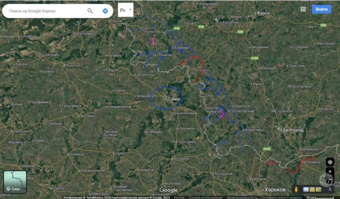 По мнению эксперта, в каждом из вариантов наступления есть и логическое его продолжение. В случае с северным - удар по Рыльску (на карте обозначено как 1) и в случае южного (обозначено как 2) - удар в тыл группировки «Север», которая сейчас ведет бои на границе Харьковской области.