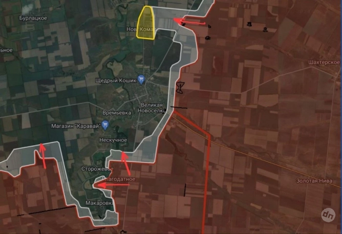 На Великоновосёлковском направлении ВС РФ ведут штурмовые действия в направлении Новый Комар. Российские войска давят южнее Великой Новосёлки в направлении Нескучного и Сторожевого, сообщает Telegram-канал "БелВПО".