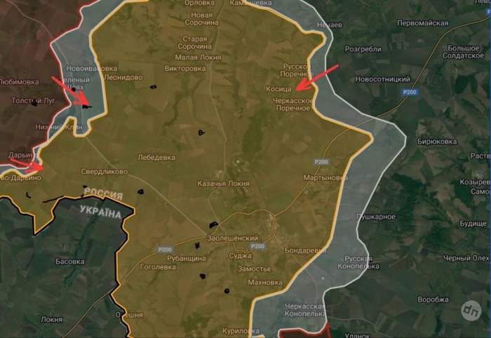 Указывается, что две отдельные группы продвигаются западнее населенных пунктов Орловка и Погребки, где российские войска вытесняют другие украинские подразделения из приграничных территорий Курской области.