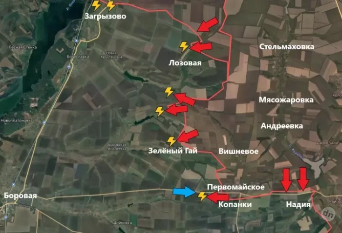 На Боровском направлении подразделения ВС РФ продолжают окружение Лозовой - продвижение есть как с северного, так и с южного фланга. Идут бои на подступах к Зелёному Гаю. Встречные бои (с контратаками ВСУ) зафиксированы в районе Первомайского и Копанок. Наши бойцы закрыли карман восточнее Первомайского, продвинувшись в направлении Надии.
