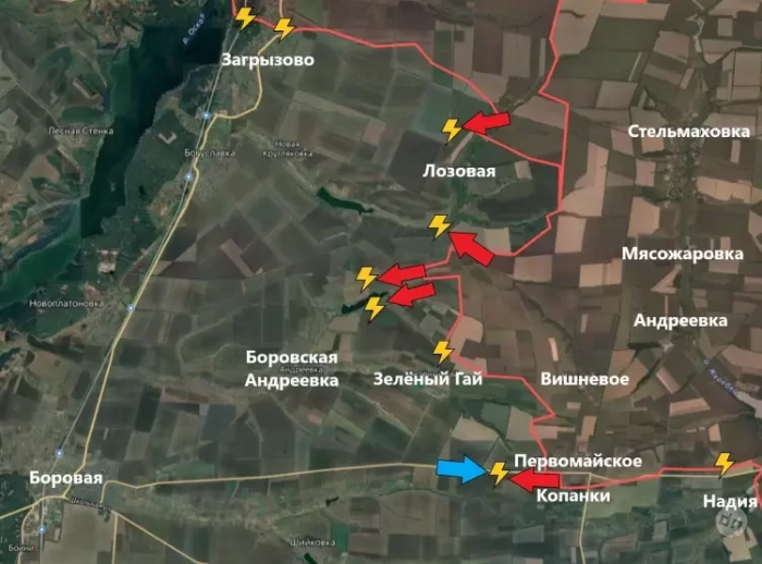 Продолжаются встречные бои в районе населённых пунктов Первомайское и Копанки. Враг понимает, что отступив с этого участка, он откроет нашим бойцам путь на Боровую.