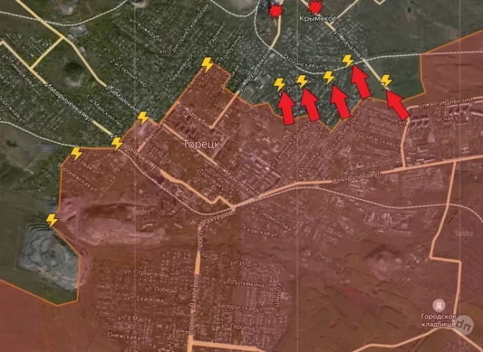 Подразделения ВС РФ существенно продвинулись в северной части - по направлению к Крымскому. Сообщается, что сейчас наносятся удары по позициям ВСУ в Крымском и чуть западнее - на территории шахты «Торецкая».