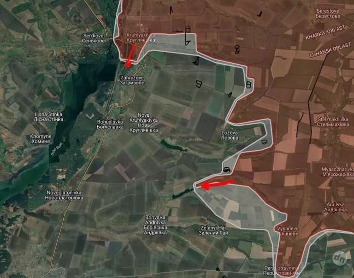 Южнее Пушкино российские войска продвинулись в направлении Украинки на участке шириной до 2.3 км на глубину до 1.35 км. Под контроль ВС РФ перешла Солнцевка, а также участок на западной окраине шириной до 1.95 км.