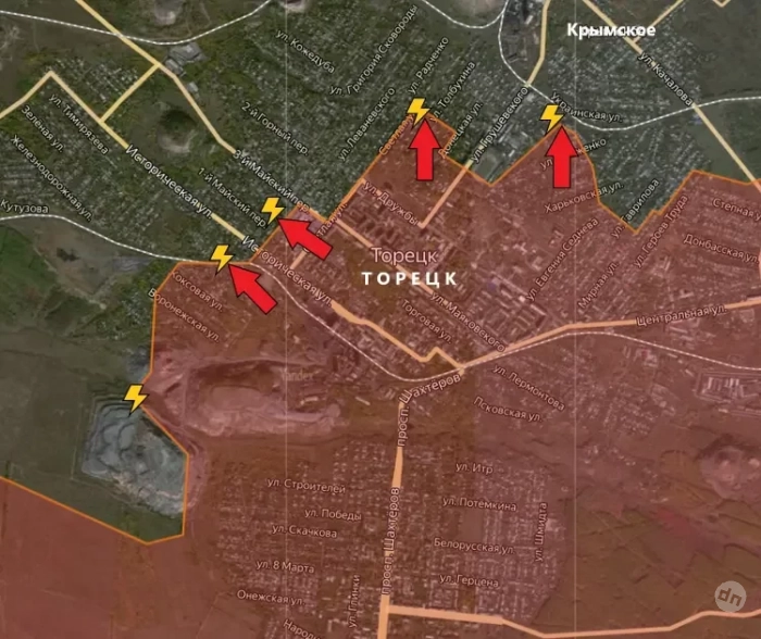 На Торецком направлении в Торецке наши бойцы продолжают наступление в центральной части города. На днях штурмовые отряды ВС РФ закрепились в районе центрального рынка. Теперь же они пытаются продвинуться дальше на запад, в сторону террикона. Также продолжаются попытки прорваться к Крымскому и шахте «Торецкая». Впоследствии это позволит выйти к железной дороге. За последние сутки продвижений на этом участке нет. Враг продолжает жаловаться на то, что оборонять позиции становится всё сложнее.