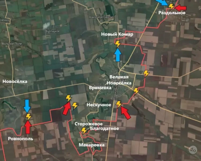 На Великоновосёлковском направлении ВСУ продолжают безуспешные попытки контратак в районе Нового Комара и Раздольного, сообщает PulsePen.