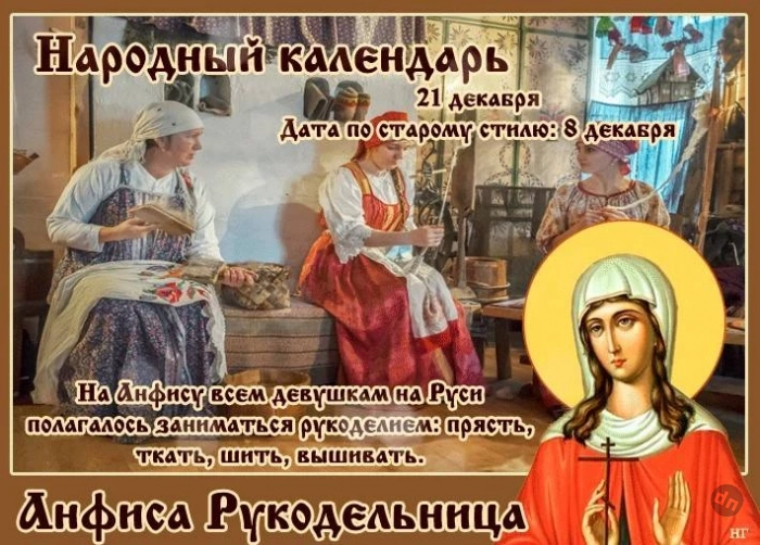 21 декабря в русских народных традициях был посвящен Анфисе Римской, которую часто называли Анфисой Рукодельницей. Этот день был особенным для девушек, так как им полагалось заниматься рукоделием. Шить, прясть или ткать следовало в одиночестве, чтобы избежать сглаза и дурных глаз со стороны.
