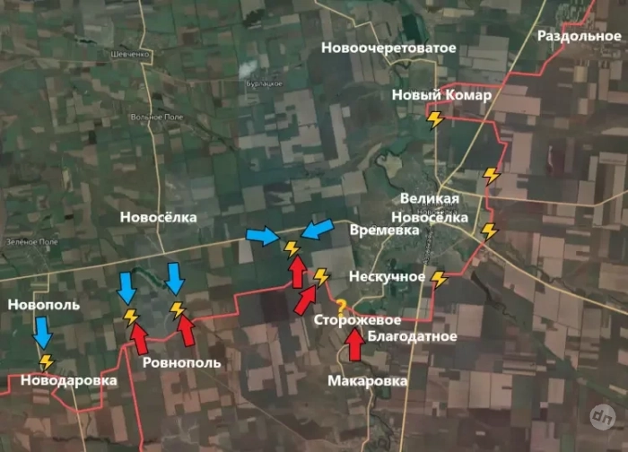 Наиболее ожесточённое сопротивление враг оказывает на юго-западном участке. И если посмотреть на карту, то становится очевидно почему. ВСУ всеми силами стараются защитить последний путь снабжения гарнизона ВСУ в Великой Новосёлке, который также является и единственным нормальным путём отступления из посёлка городского типа Великая Новосёлка.