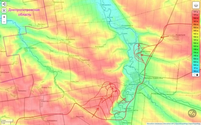 Между тем, занятие этих опорников несет для частей ВСУ в Большой Новосёлке массу серьёзных вызовов. Дело в том, что следующая хорошо оборудованная линия обороны противника находится довольно далеко на север и уже прикрывает не этот населённый пункт, а выход в Днепропетровскую область.