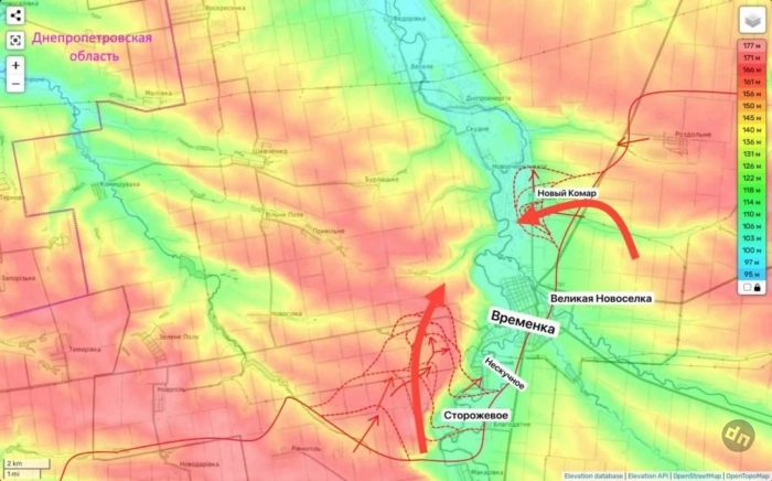 "Между тем, сейчас у частей противника в этом районе, остается пожалуй, последняя возможность это сделать. И это стало следствием крайних успехов ВС РФ западнее реки Мокрые Ялы. Где они последовательно берут под контроль холмы над Нескучным и Времеевкой. Причем, даже та грунтовая дорога, по которой, пусть и под непрекращающимся огнем ещё можно как-то проникать в Большую Новоселку и выбираться из неё, уже практически находится под огнём из стрелкового оружия (правда, на предельных дистанциях)", - пишет эксперт.