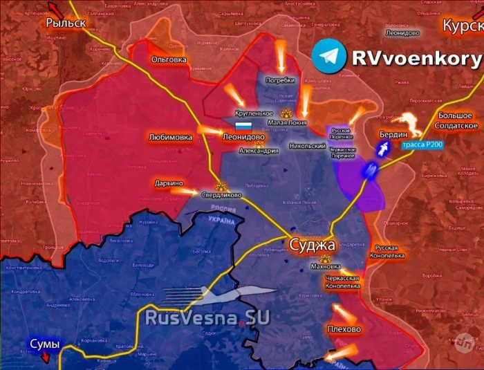 Вчерашняя неудачная попытка наступления ВСУ пока не получила никакого продолжения, хотя в районе Суджи, откуда ВСУ выдвигались вчера, есть движение вражеских сил. По данным американского Института изучения войны (которые далеко не всегда отражают реальность), украинские военные зашли в южную часть Бердина и дошли до дороги, которая соединяет его с Новосотницким. По подсчётам аналитиков, ВСУ смогли пройти примерно на 2,7 км вглубь территории России. Однако судя по данным с мест, закрепиться там они не смогли.