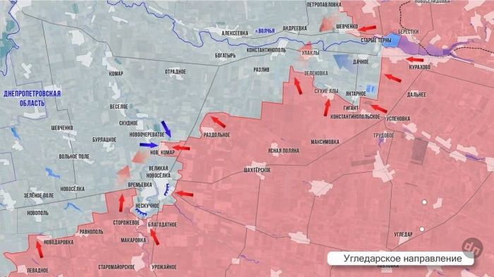 На Угледарском фронте ВС РФ освободили еще примерно 4 км², взяв под контроль участок дороги от Великой Новосёлки до Новосёлки. В районе Улаклы-Константинополь-Разлив идут ожесточённые бои. Противнику пока удается сдерживать атаки нашей армии. Возобновились интенсивные бои за Янтарное, западнее которого наши отбили у ВСУ несколько позиций. Стремительно ухудшается положение гарнизона ВСУ в районе Дачного. ВС РФ заняли опорный пункт на северном берегу Волчьей и установили огневой контроль над участком трассы Курахово-Запорожье.