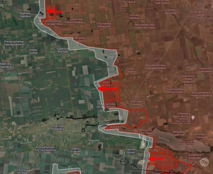 На Покровское направление. Российские войска прорвали оборону ВСУ и продвинулись южнее Барановки на участке шириной до 1.65 км на глубину до 550 м., в районе Воздвиженки расширили контроль территории и продвинулись на глубину до 650 м. в направлении автодороги Покровск-Константиновка.