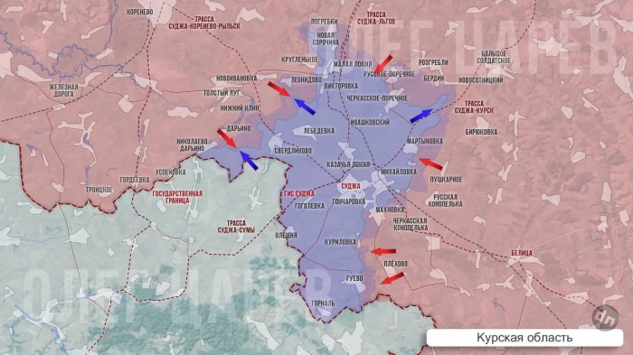 Главное направление наступления наших войск - с запада оккупированного района от Новоивановки через Леонидово и Александрию к трассе Суджа-Льгов. Наступление идет широким фронтом, от Погребков до Никольского. В некоторых местах ВС РФ уже перешли реку Малая Локня.