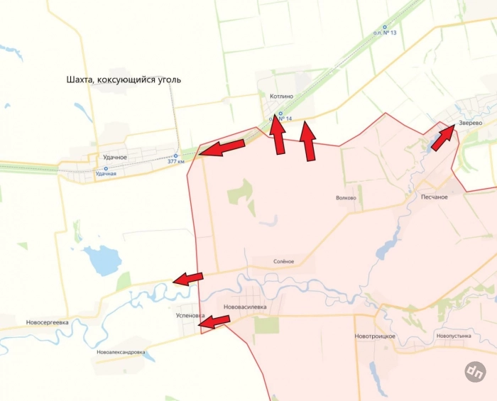 Штурмовые отряды Армии России зашли на южные окраины Котлино. Некоторые источники утверждают, что нашим бойцам удалось там закрепиться. Помимо этого, есть движение на запад - в направлении Удачного, севернее которого располагается месторождение коксующегося угля.