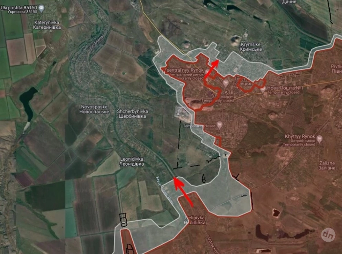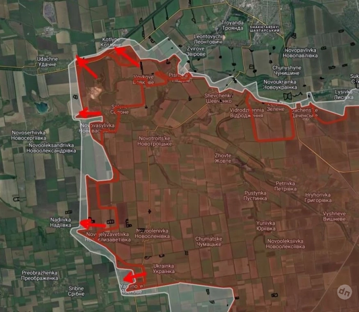 Под контроль российских войск перешла территория от восточной окраины Удачное до западной окраины Котлино на участке шириной до 2.45 км.