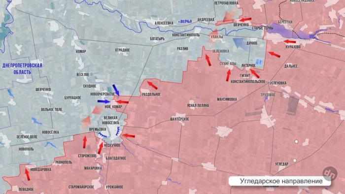 На Угледарском фронте есть новые успехи ВС РФ в районе Времевки. Наши продвинулись вдоль главной улицы села - Партизанской и забили клин в оборону противника. Эта улица выходит к мосту, разделяющему Времевку и Великую Новоселку, то есть, блокирует все выезды из поселка. Времевка еще не под нашим контролем, но Великая Новоселка уже по сути в окружении. Вариантов вывести гарнизон у ВСУ уже не осталось, разве что пойдут по самой большое речке Мокрые Ялы. Хотя и это им может не помочь: по оперативным данным, штурмовики в районе Нового Комара вышли к берегу и укрепляют там плацдарм. В районе Кураховского котла ВС РФ закрепились на восточной и юго-восточной окраинах Дачного. В районе Сухих Ялов, Янтарного и Зеленовки армия России продвигается на север. Авиаударом сильно поврежден мост между Константинополем и Улаклы, что должно усугубить положение ВСУ внутри этого котла.