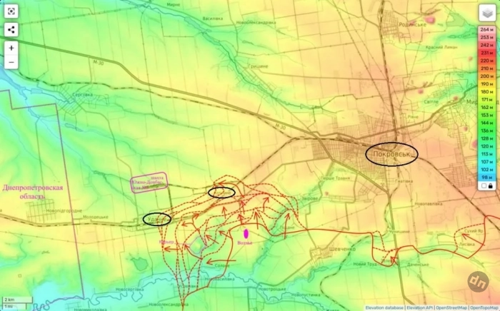 Согласно данным прозападных источников, армия России находится всего в 4,5 километрах от границ Днепропетровской области. Это заметное сокращение расстояния - всего неделю назад оно составляло 6,5 километров. Фронт вчера максимально приблизился к Днепропетровской области со стороны Удачного, расположенного к юго-западу от Покровска. Удачное является ключевым пунктом, где находится последняя подконтрольная Украине шахта коксующегося угля, и оно активно штурмуется подразделениями российских войск. Это создает дополнительное давление на украинские силы, которые находятся в затруднительном положении.