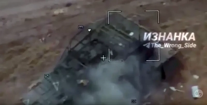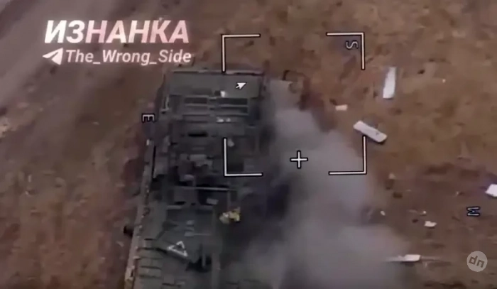 Судя по кадрам, российский беспилотник угодил в боковую нижнюю часть башни танка. Ставший давно привычным антидроновый «мангал» не помог. В принципе, машина внешне выглядит вполне целой, взрыва боекомплекта, скорее всего, не было. Хотя видно, что одну из гусениц ОБТ оторвало. Не исключено, что ударов БПЛА было несколько, либо танк наехал на мину.