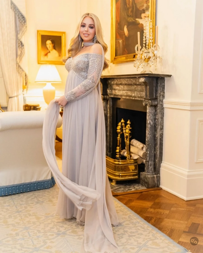 На снимках Тиффани позирует в сером платье Zuhair Murad с открытыми плечами. Верх изделия украшен вышивкой и драпирован тонким шарфом, а шифоновая юбка свободного силуэта подчёркивает округлившийся живот.