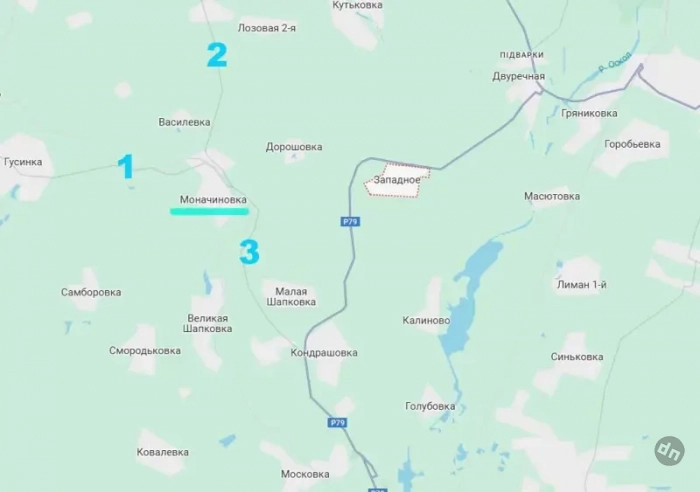При дальнейшем успехе ВС РФ может появиться возможность дойти до села Моначиновка, а оно находится на «слиянии» сразу двух путей снабжения противника. Одна дорога идёт со стороны Печенежского водохранилища, другая - от Великого Бурлука на севере Харьковской области. За Моначиновкой дороги переходят в одну, ведущую в Купянск с северо-запада. Они помечены последовательно цифрами на фрагменте карты: