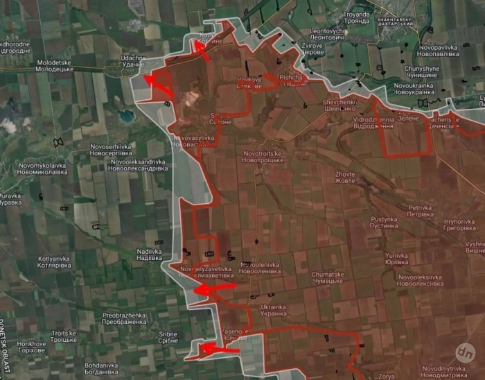 ВС РФ имеют тактические успехи западнее Котлино, продвинулись на глубину до 750 м, южнее Удачное на глубину до 1.82 км и южнее Новоелизаветовки на глубину до 1.35 км.