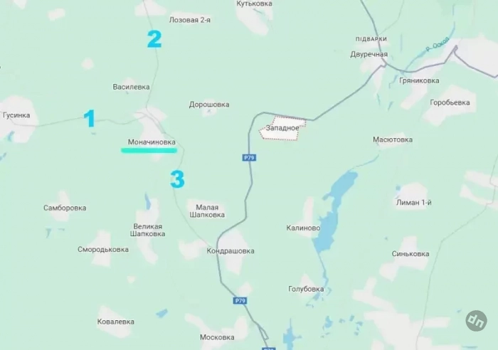 При дальнейшем успехе ВС РФ может появиться возможность дойти до села Моначиновка, а оно находится на «слиянии» сразу двух путей снабжения противника. Одна дорога идёт со стороны Печенежского водохранилища, другая - от Великого Бурлука на севере Харьковской области. За Моначиновкой дороги переходят в одну, ведущую в Купянск с северо-запада. Они помечены последовательно цифрами на фрагменте карты: