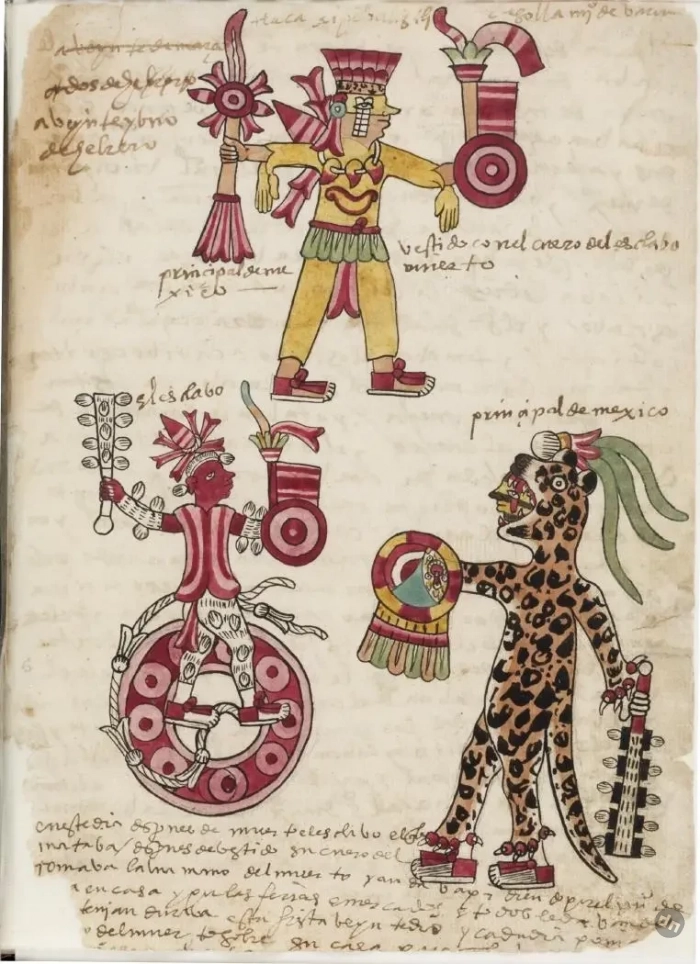 Воин-ягуар с трехчастно раскрашенным щитом. «Кодекс Мальябекки - один из ацтекских кодексов, созданный в Мексике в XVI веке, в начальный период конкисты. Назван в честь Антонио Мальябеки (Мальябекки), итальянского собирателя рукописей XVII века. Сейчас находится в Национальной центральной библиотеке во Флоренции