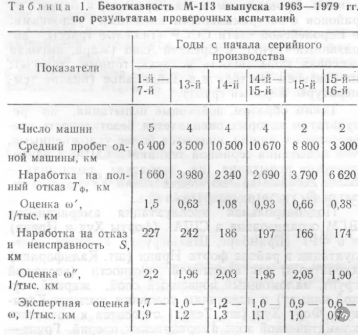 Общая оценка безотказности М-113 определена на уровне ω≈1,2 1/тыс. км, состав отказов (примерно равное количество отказов силовой установки, ходовой части и электрооборудования) свидетельствует об обработанности конструкции. Следует отметить, что подконтрольная эксплуатация бронетранспортеров в США проводилась в более легких условиях, чем отечественных БМП-2, большинство из которых эксплуатируется в условиях абразивных грунтов и разбитых танковых трасс Прикарпатья.