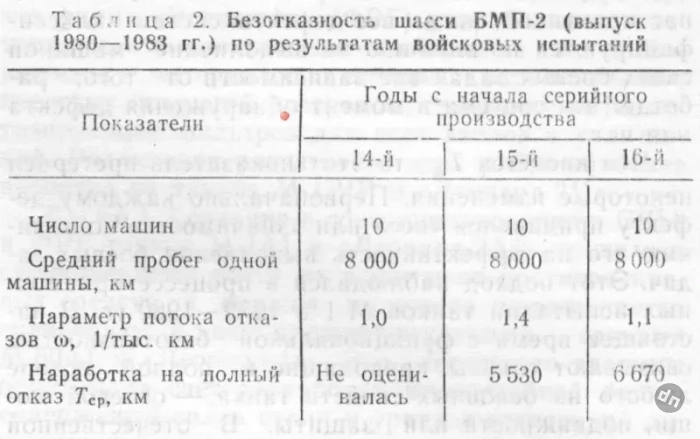 Для сравнения приведены основные данные по безотказности шасси отечественной БМП-2 (табл. 2).