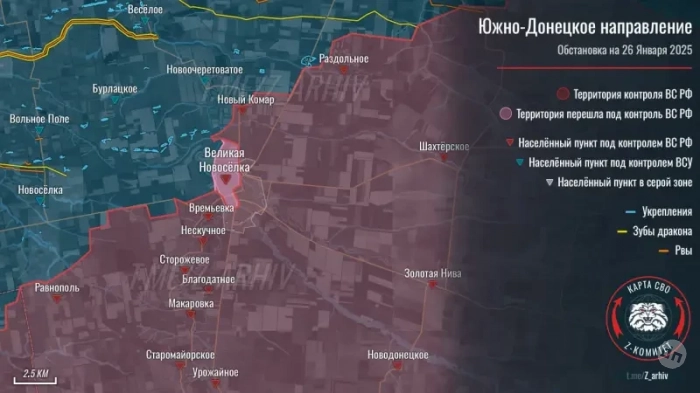 Взятие под контроль российскими войсками Великой Новоселки на бывшем Времевском выступе является грандиозным успехом не только группировки «Восток», но и всех ВС России. Вчера, 26 января 2025 года, бывший Времевский выступ, где ВСУ в рамках летнего контрнаступления пытались прорваться к Мариуполю, перестал существовать. Для этого штурмовым подразделениям группировки «Восток» понадобилось восемь месяцев. Начав освобождение со Старомайорского 10 июня 2024 года, бойцы 13 июля освободили Урожайное и после длительного перерыва, уже в декабре, приступили к дальнейшему продвижению. 5 декабря было освобождено Благодатное, 22 декабря — Сторожевое, а затем 13 января 2025 года — Нескучное, 17 января — Времевка и 26 января — Великая Новоселка.