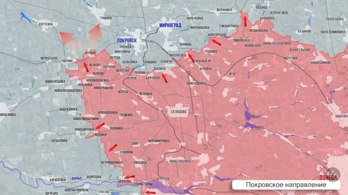 На Покровском фронте упорные бои в Удачном, где ВС РФ теснят ВСУ и приближаются к территории ж/д станции. В районе Котлино наши расширили подконтрольную территорию к северу и к востоку, в сторону Зверево. Чуть южнее продолжаются тяжелые бои в районе Успеновки - Новоалександровки. Еще ниже по карте сообщают об освобождении Надеждинки, там продолжается зачистка. До следующего села Котляровка чуть больше 4 км, а до Новопавловки - около 13 км. В Новоандреевке тоже есть успехи, бои сместились в соседнее Срибное. На восточном фланге бои на подступах к Новоукраинке и Чунишино. Сильные бои в районе Миролюбовки, Елизаветовки, Водяного Второго.
