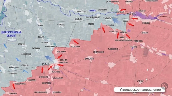 На Угледарском направлении вероятно, здесь будет некоторое снижение активности - наши будут подтягивать снабжение и проводить перегруппировку сил. Возможны несколько сценариев дальнейших действий. Первый: движение на запад вдоль дороги на Гуляйполе, во фланг Запорожскому направлению. Второй: движение к Богатырю и Комару и поворот по дороге на Запорожье. Третий: глубокий клин в оборону ВСУ к дороге Покровск-Днепропетровск. А пока бои идут в районе Нового Комара и Новоочеретоватого. К западу от Курахово тяжелые бои в Дачном, где ВСУ возвели мощные рубежи. Позиционные бои вдоль северного берега Сухих Ялов - от Зеленовки до Янтарного. Штурмы армии России идут по линии Улаклы - Константинополь. На другом берегу продолжается интенсивное встречное сражение в Андреевке. Под контролем ВС РФ северо-восточная окраина, противник мощно контратакует, чтобы удержать от полного «захлопывания» крышку Кураховского «котла».