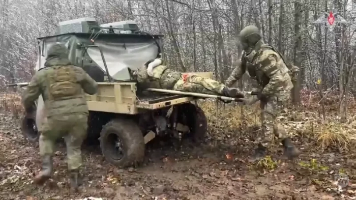 Погрузка раненого перед эвакуацией. Фото Минобороны РФ