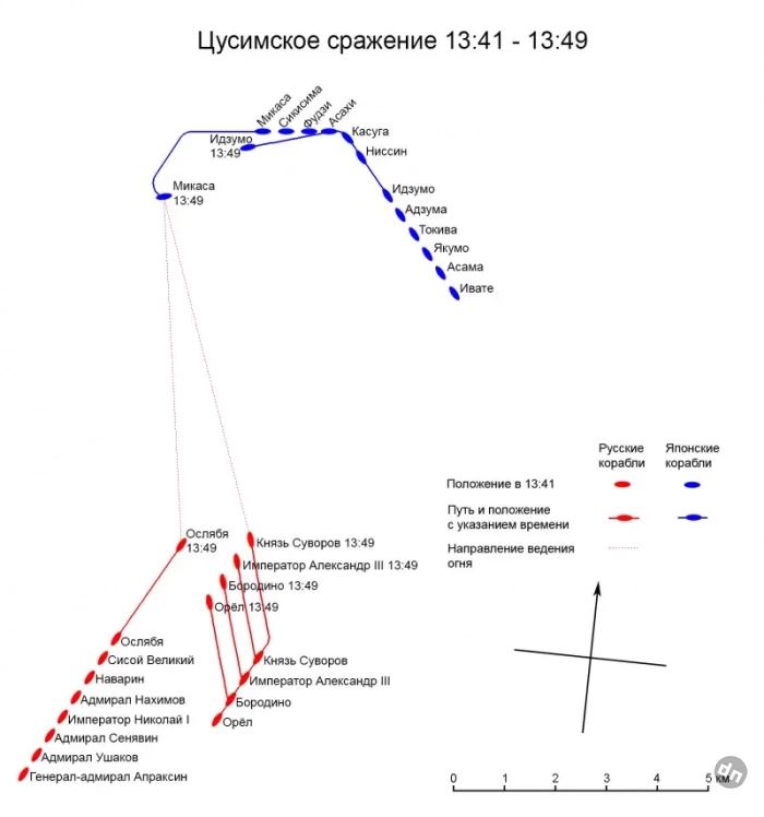 Схема маневрирования в Цусимском сражении 13:41-13:49