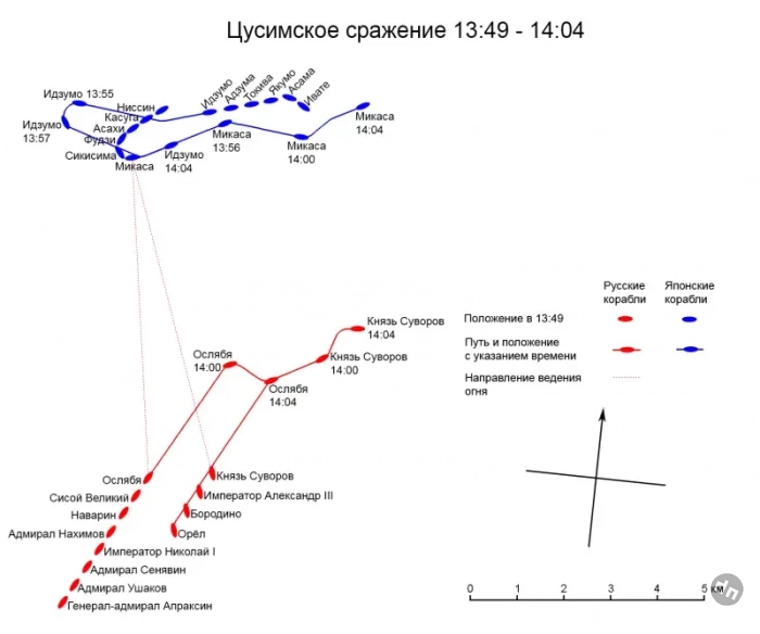 Схема маневрирования в Цусимском сражении 13:49-14:04