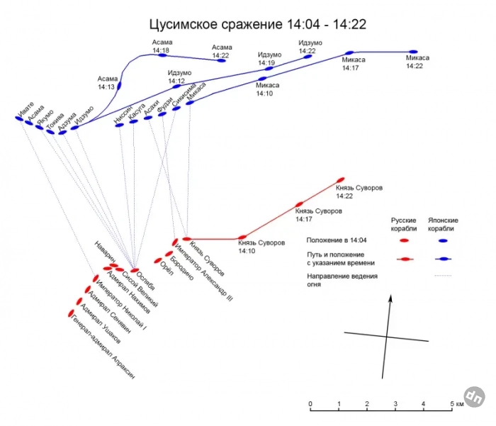 Схема маневрирования в Цусимском сражении 14:04-14:22