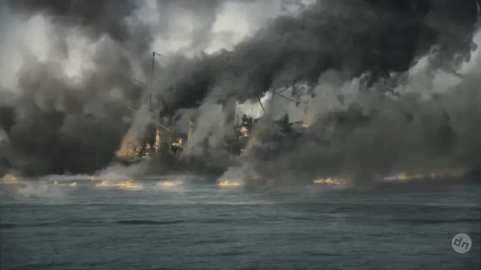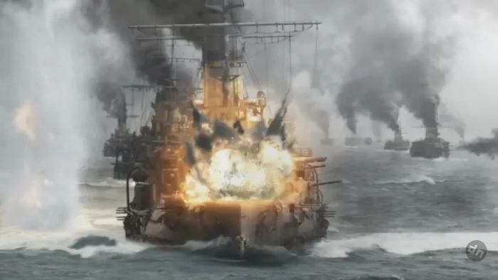 Попадание в броненосец «Князь Суворов». Кадр из фильма «Тучи над холмами»