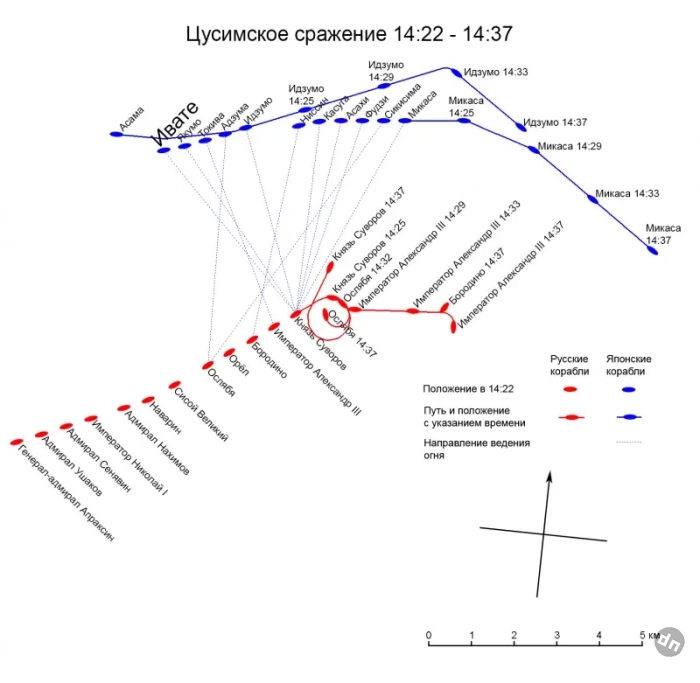 Схема маневрирования в Цусимском сражении 14:22-14:37