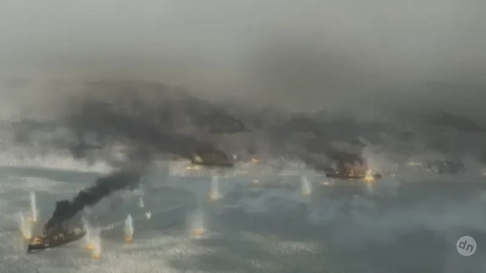 Русские броненосцы открывают огонь по противнику. Кадр из фильма «Тучи над холмами»