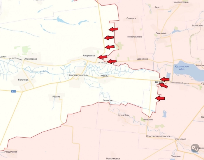 На Константинопольском направлении наши штурмовые отряды заняли восточную часть Дачного. Бои идут и на восточных окраинах Андреевки. Чуть севернее населённого пункта нашими войсками расширена зона контроля.