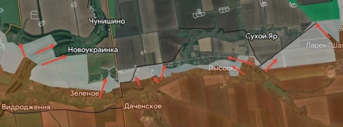 На Днепропетровском направлении в наши бойцы идут вперёд в районе Успеновки, а также Серебряного (Срибного), где мы зацепились за застройку и южнее по направлению к Андреевке.