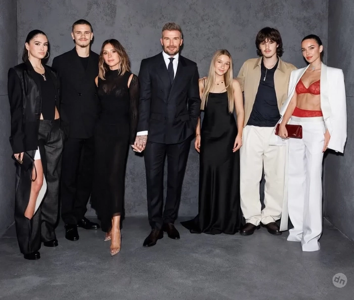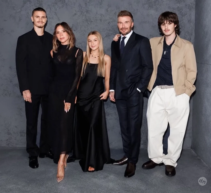 50-летняя супруга футболиста позировала в платье собственного бренда Victoria Beckham, а 13-летняя Харпер надела платье из шёлка в пол. Новая возлюбленная младшего сына пары Круза, Джеки Апостел, которая старше него на 11 лет, пришла в белом костюме и красном кружевном белье. Средний сын Виктории и Дэвида Ромео тоже вывел в свет новую возлюбленную Ким Тернбулл. Девушка пришла в чёрных брюках с разрезами и жакете.