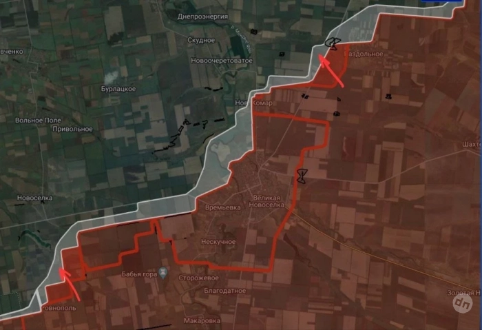 На Великоновосёлковском направлении ВС РФ расширили контроль территории и продвинулись в районе Раздольного на участке шириной до 2.6 км на глубину до 950 м. и в районе Ровнополя на участке шириной до 3.23 км на глубину до 900 м.