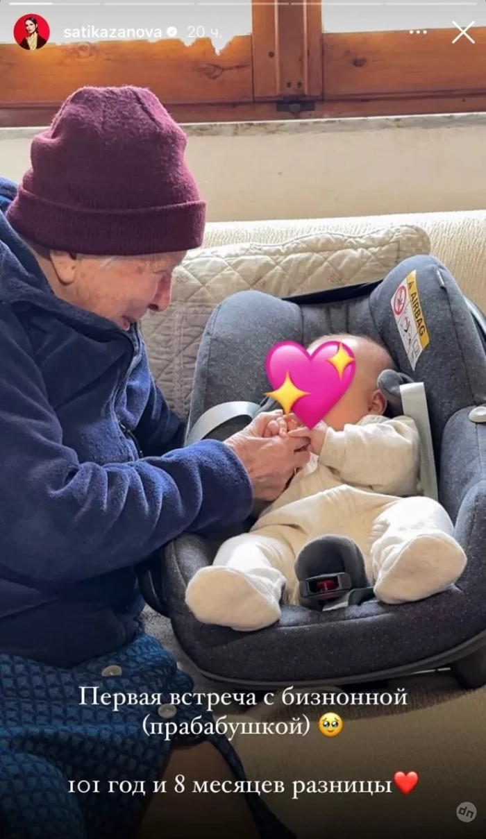 42-летняя Сати Казанова, которая в прошлом году впервые стала мамой, показала, как прошла встреча ее маленькой дочери со 101-летней прабабушкой.