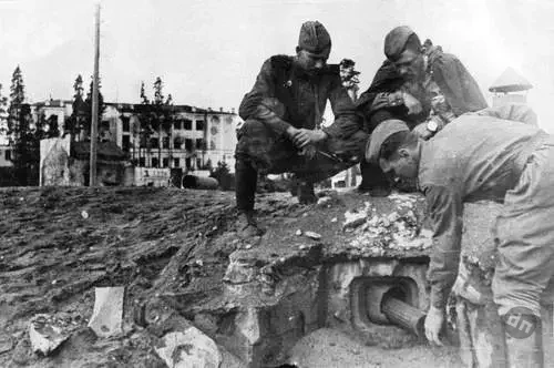 Бойцы после штурма Медвежьегорска рассматривают финский бронеколпак с пулемётом. Наша команда смогла его идентифицировать по развалинам здания санатория на заднем плане фото и выбранному ракурсу съемки. На финской схеме он имел обозначение V42