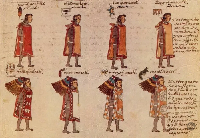 Рядовые воины и их командиры в мирное время носили приметный плащ-тильматли размеров 1,22-1,83 м, который скреплялся пряжкой на правом плече и, свободно ниспадая вдоль тела, закрывал левую руку и обнажал правую. Простолюдин, сражавшийся в битве и взявший одного пленника, получал плащ, украшением которого являлись цветы (вот только непонятно, живые или искусственные, ведь живые нужно было бы тогда постоянно менять!). Два пленника обозначал тильматли оранжевого цвета с полосатой каймой. Ну а дальше – чем выше ранг и больше пленных, тем сложнее и богаче узоры были на плаще. Европейцы сравнивали подобные ткани, из которых шились эти плащи, с лучшими европейскими нарядами, сделанными из шелка.