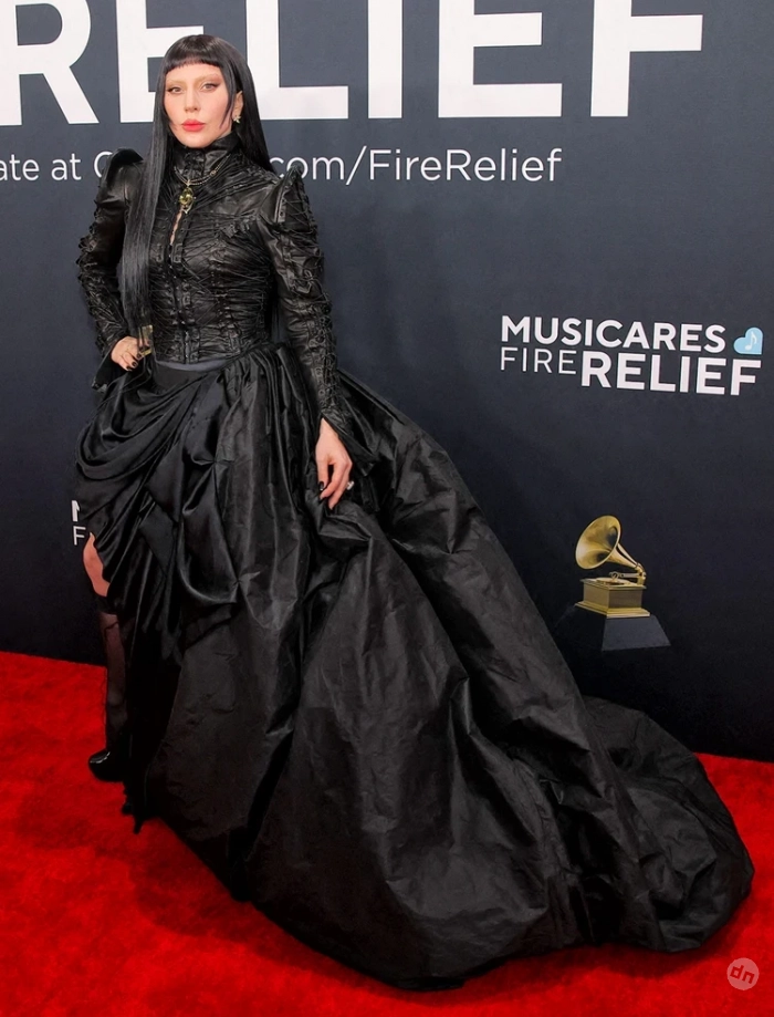 Леди Гага появилась на дорожке в максимально закрытом готическом наряде от Samuel Lewis. Кожаный верх платья был дополнен пышной юбкой в пол. Также певица и актриса примерила черный парик с актуальной сейчас укороченной челкой baby bangs.