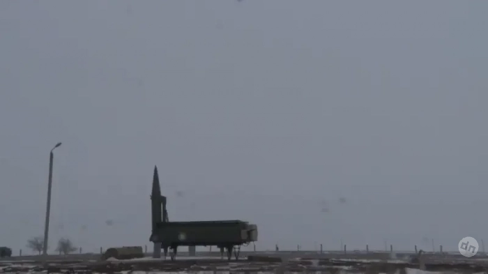 Среди прочих изделий в кадр попала опытная пусковая установка ОТРК, размещённая не на стандартном автомобильном шасси, а на опорах на грунте. На установке находилась ракета с необычными пропорциями корпуса. Затем был показан старт этой ракеты. Никаких пояснений не приводилось, хотя по характерным чертам в установке и ракетах можно было узнать компоненты «Искандера».